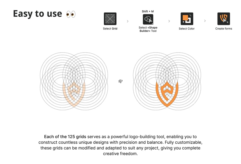 Each grid serves as a powerful logo-building tool, enabling you to construct countless unique designs with precision and balance. Fully customizable, these grids can be modified and adapted to suit any project, giving you complete creative freedom.